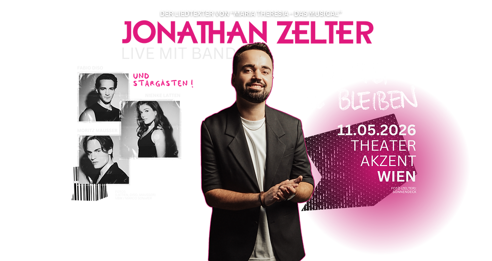 Nach seiner erfolgreichen Deutschlandtour 2025 kommt Jonathan Zelter, der Sänger, Songwriter und Liedtexter des VBW-Hitmusicals „Maria Theresia“, erstmals mit einem exklusiven Konzert nach Österreich. Ein Abend, der berührt, überrascht und begeistert: Lieder, die Geschichten erzählen. Worte, die bleiben. Musik, die unter die Haut geht. Mit Hits wie „Ein Teil von meinem Herzen“, diversen Gold- und Platin-Auszeichnungen und Songs für Stars wie Roland Kaiser oder Peggy March zählt Jonathan Zelter heute zu den erfolgreichsten deutschsprachigen Songwritern seiner Generation. Für sein Wien-Debüt hat er die gefeierten „Maria Theresia“- Hauptdarsteller:innen Nienke Latten, Fabio Diso und Moritz Mausser als Special Guests eingeladen. Gemeinsam mit ihnen und seiner Live-Band präsentiert Zelter besondere Arrangements seiner Werke zwischen gefühlvollem Schlager, Pop-Ballade und rockigem Musical - kraftvoll, intim, überraschend. Und Fans von „Maria Theresia“ dürfen sich selbstverständlich auf ganz besondere musikalische Überraschungen freuen, die es so nur an diesem Abend geben wird! Ein Abend für alle, die Musik mit Tiefgang und Bedeutung lieben.